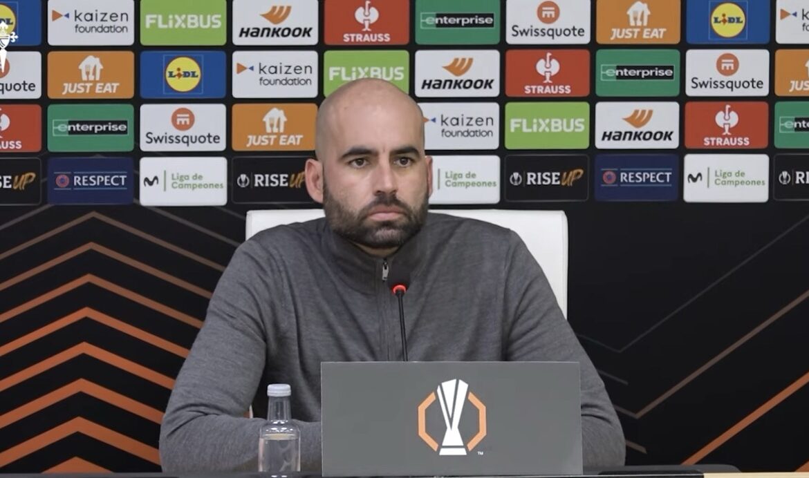 Claudio Giraldez ha comparecido ante los micrófonos de Movistar y después en la sala de prensa de Balaidos para el resto de medios de comunicación .