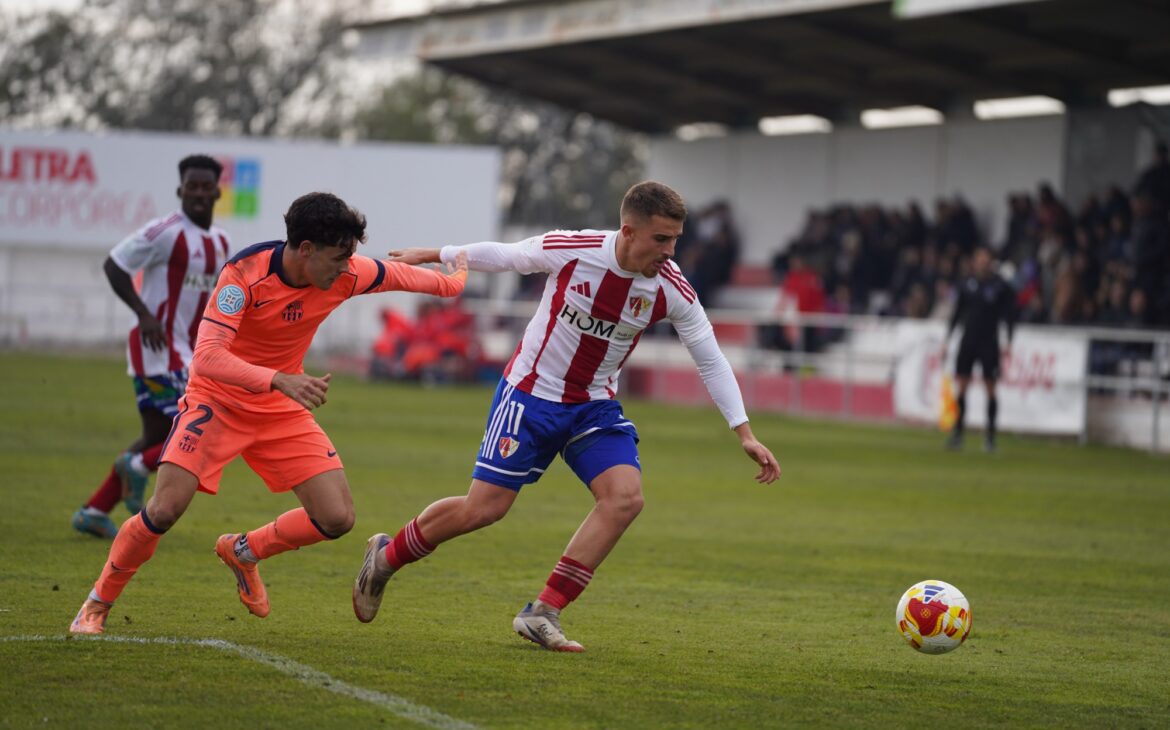 El filial azulgrana sufrió más de lo esperado en el Municipal, pero los goles de Dani Rodríguez y Álvaro Cortés, este último desde el punto de penalti en el tramo final, le dieron tres puntos vitales para seguir en la pelea por el liderato del Grupo 3 de Segunda Federación.