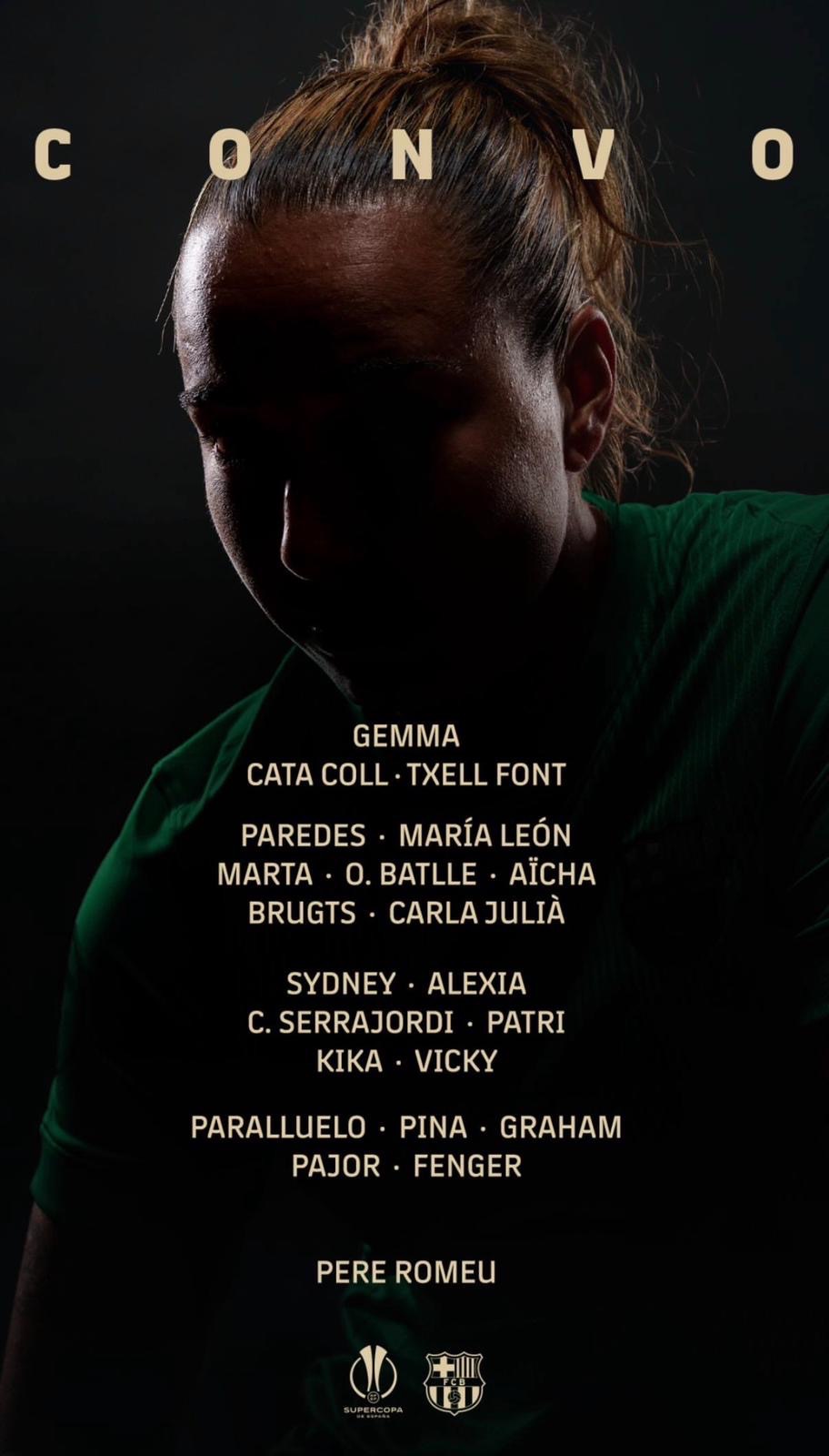 La expedición azulgrana viajó con 21 jugadoras, un grupo condicionado por las ausencias de Laia Aleixandri y Aitana Bonmatí, ambas baja por lesión. Antes del entrenamiento oficial, se guardó un minuto de silencio por las víctimas del accidente ferroviario ocurrido en Adamuz (Córdoba). Entre las convocadas destacan nombres como Paredes, María León, Graham Hansen, Alexia Putellas, Patri Guijarro, Cata Coll, Pajor, Paralluelo y Vicky López, además de las jóvenes Carla Julià y Txell Font.