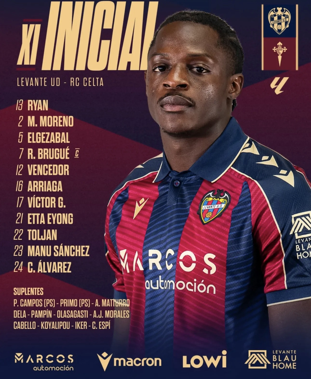 Cambio en el Levante: se marchaba Roger Brugué y entraba Espí y cambio en el Celta : se marchaba Marcos Alonso, que tenía tarjeta, y entraba Carlos Domínguez.