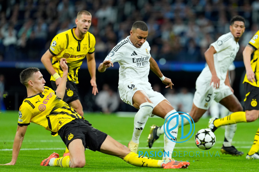 La primera ocasión llegó de las botas de Guirassy tras un centro lateral que remató el ariete africano y que Courtois atajó sin problemas (min. 5). La réplica madridista llegó con un disparo de Mbappé, tras un saque de falta de Modric, y que la defensa del Borussia Dortmund despejó a córner (min. 8). A partir de entonces el Madrid se fue estirando y llegando al área teutona con mayor peligro. La electricidad de Mbappé y Vinícius obligaba a defender en bloque bajo al Dortmund y a multiplicar las ayudas al lateral diestro Ryerson.