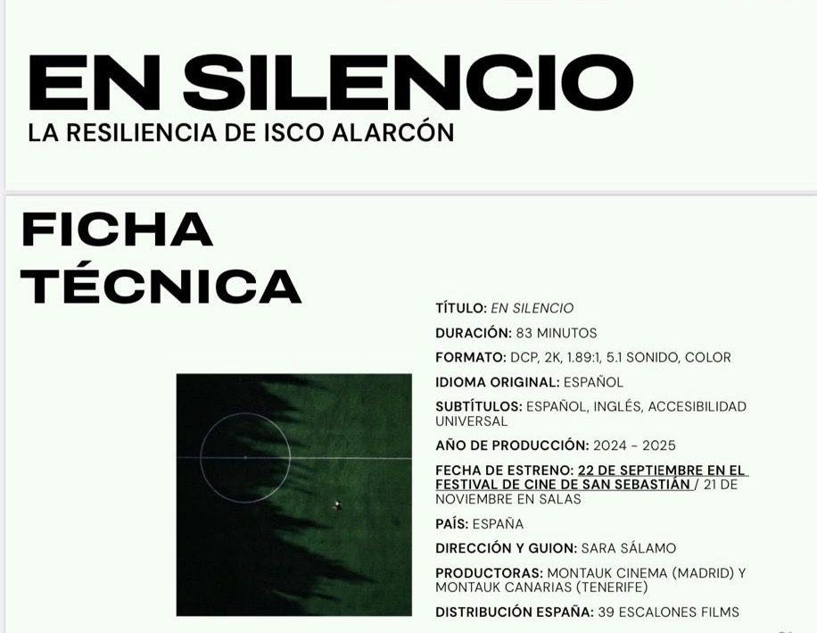 El Festival de Cine Europeo de Sevilla celebró este jueves 13 de noviembre, en el Cartuja Center, la presentación de En silencio. La resiliencia de Isco Alarcón, un documental escrito y dirigido por Sara Sálamo que narra el proceso de recuperación física y emocional del futbolista Isco Alarcón. La cinta, incluida en la sección Panorama Andaluz, llegará a las salas de cine el próximo 21 de noviembre, después de haberse estrenado en el Festival de San Sebastián.