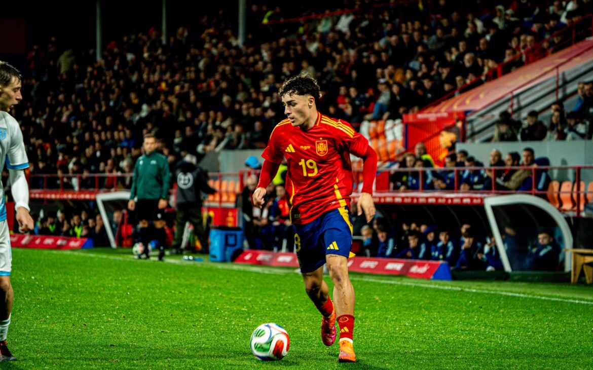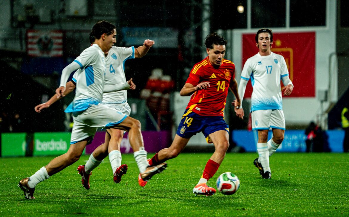 Desde el primer toque, España impuso un ritmo imposible de seguir para su rival. La pelota circulaba con velocidad, los laterales se proyectaban como dagas y los atacantes atacaban el espacio una y otra vez. San Marino apenas cruzaba el medio campo; su plan era resistir, pero la Sub-21 no estaba dispuesta a contemporizar.