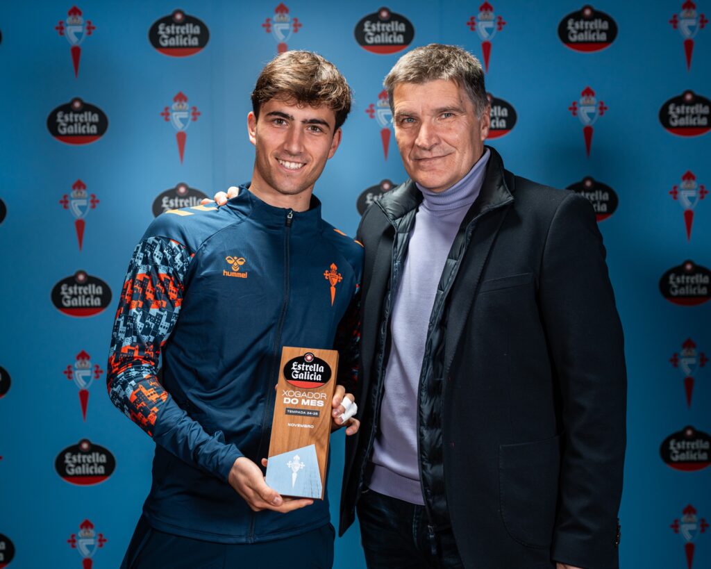 Javi Rodríguez gana su primer Premio Estrella Galicia tras un mes de ensueño para el futbolista del RC Celta. El canterano celeste ha sido elegido por los aficionados celestes como el mejor futbolista del conjunto vigués de noviembre tras imponerse en la fase final de la votación a Ilaix Moriba y Carl Starfelt.