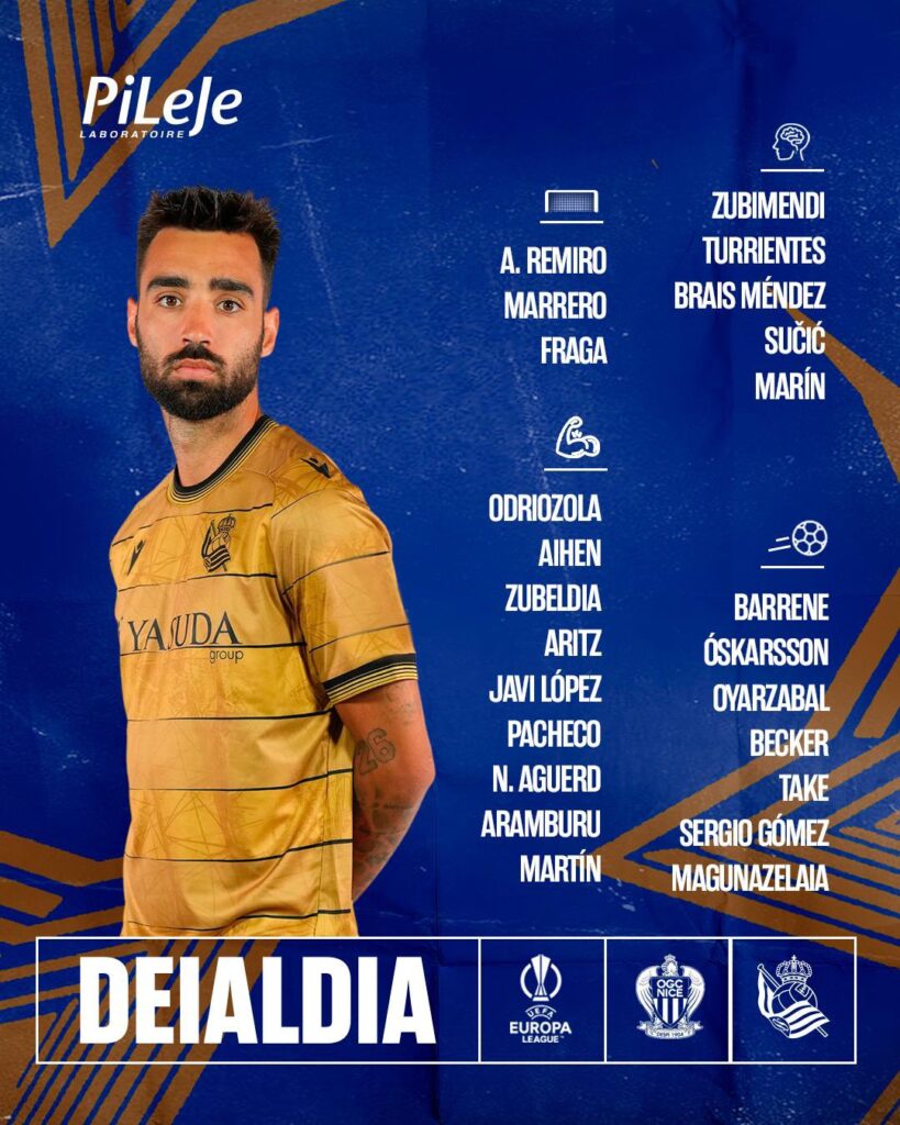 Convocatoria de la Real Sociedad ante el Niza: Remiro, Marrero, Fraga, Odriozola, Aihen, Zubeldia, Aritz, Pacheco, Javi López, Aguerd, Aramburu, Martín, Zubimendi, Turrientes, Brais Méndez, Sucic, Marín, Barrenetxea, Oskarsson, Oyarzabal, Becker, Kubo, Sergio Gómez y Magunazelaia.
