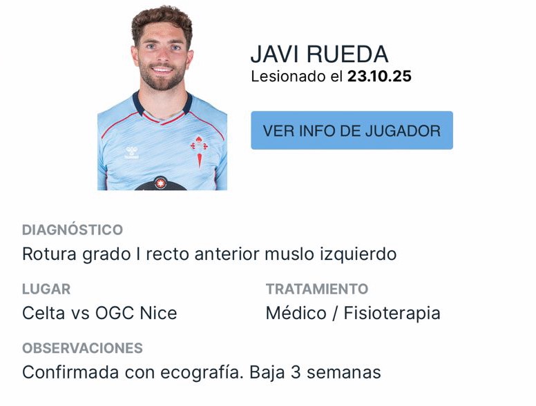 El jugador celeste que se lesionó en el encuentro de la tercera jornada de la Uefa Europa League este jueves sufre una rotura de grado I del recto anterior del muslo izquierdo . El diagnóstico ha sido confirmado por ecografía y estará aproximadamente tres semanas de baja .