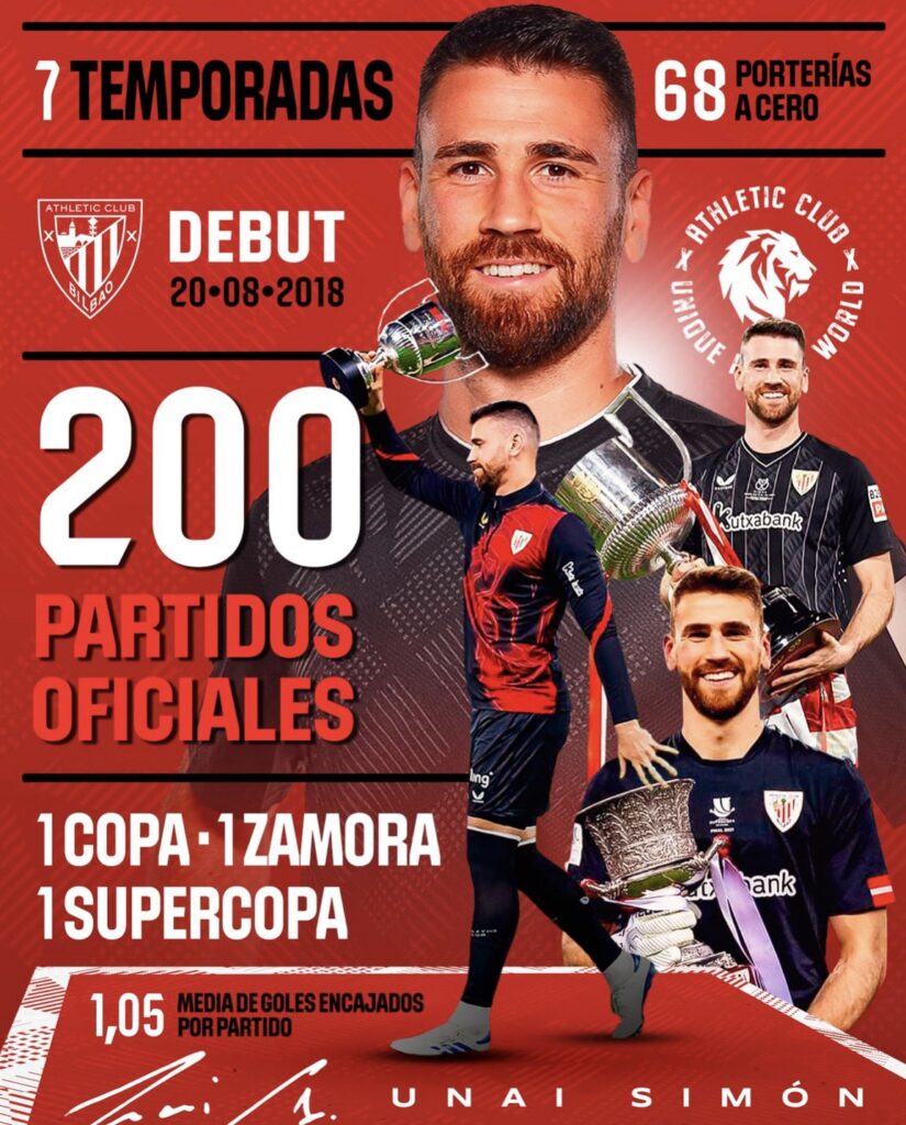 El meta lleva siete temporadas con los leones, desde que debutó un 20 de agosto de 2018 en San Mamés ante el Leganés . Unai ha estado alejado de los terrenos de juego la primera parte de la temporada puesto que tuvo que pasar por quirófano para operarse de la muñeca . Recientemente ha recuperado la titularidad de la portería y eso propiciará que agrande su leyenda en el Athletic club .